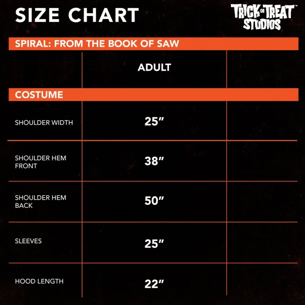 Trick or Treat Studios is proud to present the officially licensed, Spiral: From the Book of Saw – Costume! This costume is highly detailed, featuring back and arm laces and an oversized hood with spiral design details. It is the perfect accessory for the Spiral: From the Book of Saw – Pig Mask!