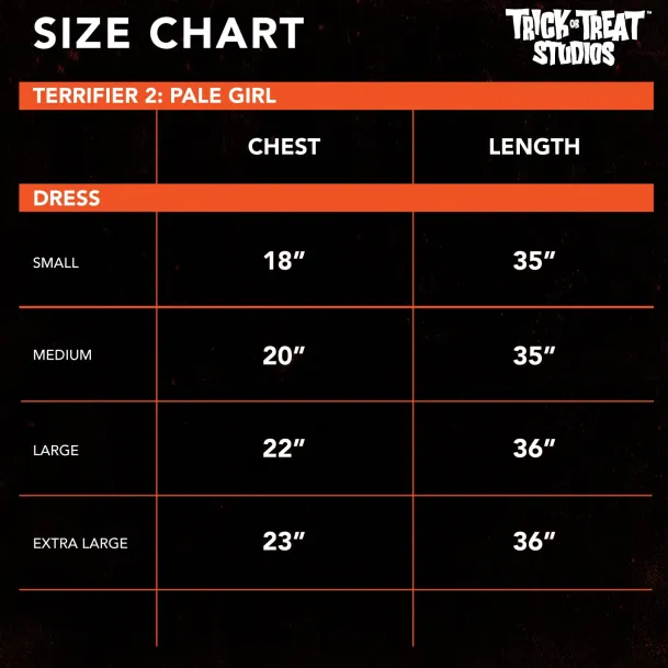 Trick or Treat Studios is proud to present the officially licensed, Terrifier 2 – Pale Girl Costume! This amazing costume was developed by taking the screen-used costume, kindly loaned to us by the production, and sending it to our factories for one-to-one replication. Every detail of the Pale Girl costume is represented in this incredible replica.