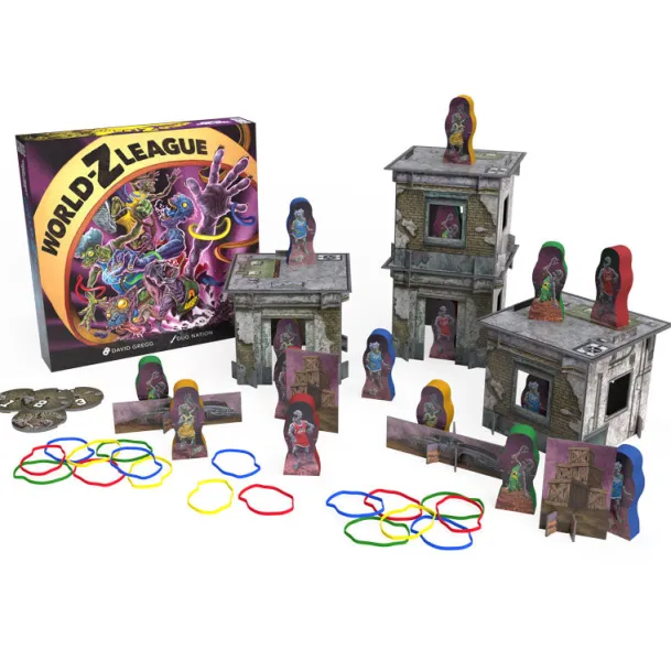 The apocalypse has come and gone with the zombies here to stay along with their counter agent the ZSA. Now dear competitors the Zombie Shooting Association welcomes you to the Z-World League! Choose your team, hide among the rubble and unleash rubber band fueled fury to knock over opposing zombies. Secure the highest earnings and be titled CHAMPION! A quick and fun game about shooting zombies with rubberbands! Rule Book Player Count 1-4 Play Time 30 Minutes Age Range 13+ Components 4 chipboard buildings, 4 obstacles, 4 score dials, 16 Zombie meeples, 40 rubber bands.